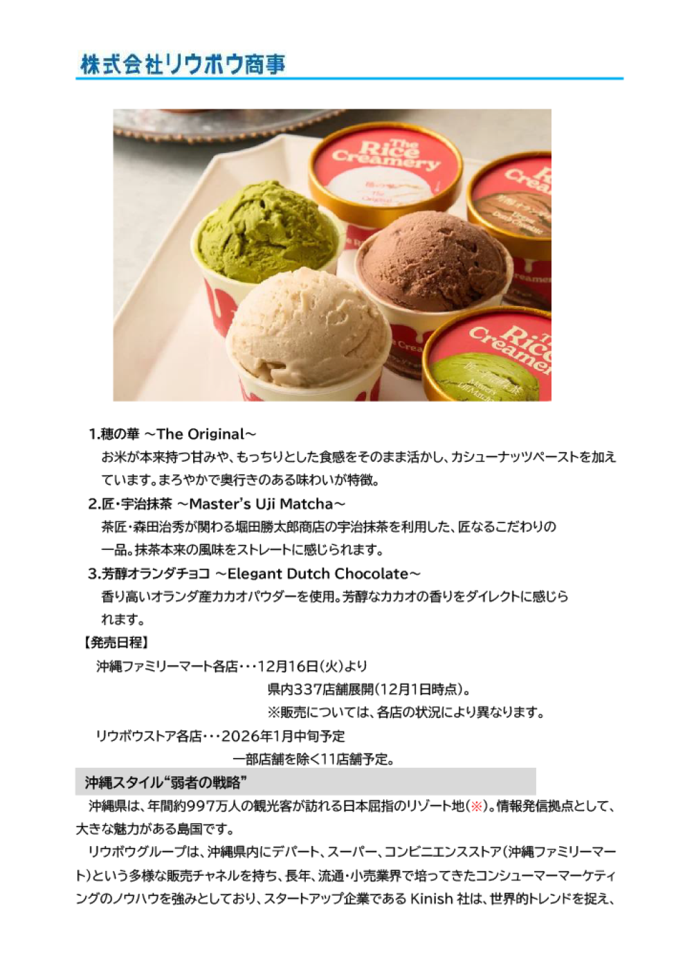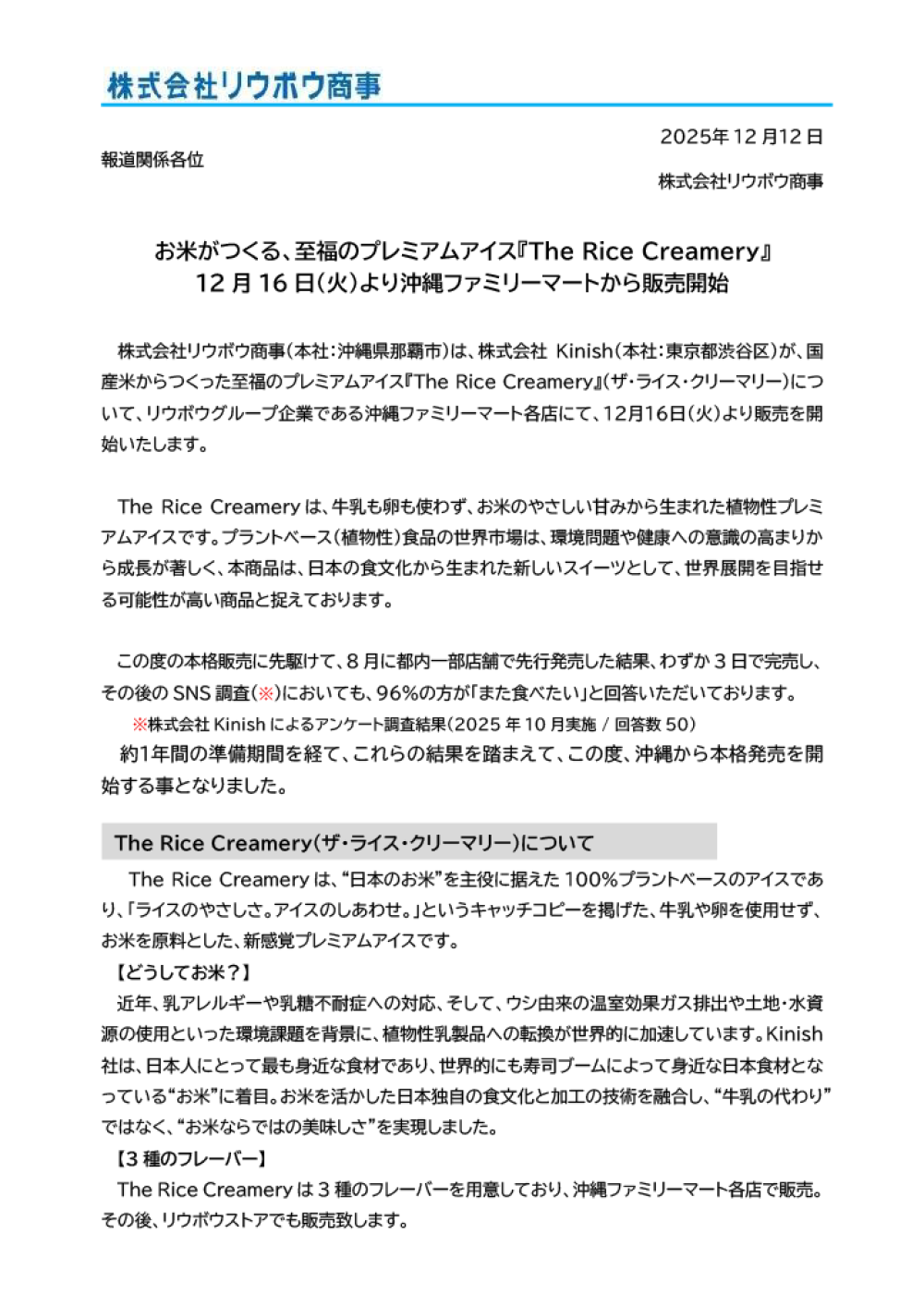 お米がつくる、至福のプレミアムアイス『The Rice Creamery』12月16日(火)より沖縄ファミリーマートから販売開始 お知らせ VOIXにてリリースが紹介されました。 2025年12月12日 一覧へ戻る